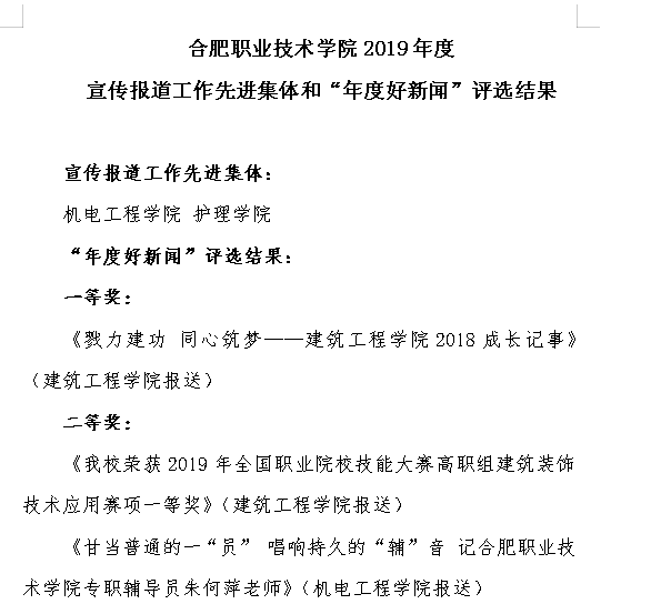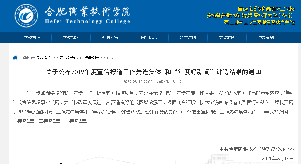 一年来,在学校党委的正确领导下,在全院教职工的大力配合下,学院深入挖掘教学、科研、人才培养工作成就和特色,积极开展新闻宣传工作,服务学校改革和学院发展大局,及时向校内外媒体报送了大量反映本单位工作特色和亮点的优秀稿件,2019年共发表新闻稿件91篇,其中外发安徽省教育网17篇。学院不断完善网站与新媒体建设,有效提升了影响力,助推了学院的内涵建设与发展。经学校党委宣传部评审,我院获评2019年度合肥职业技术学院宣传报道工作先进集体,新闻稿《甘当普通的一“员” 唱响持久的“辅”音 记合肥职业技术学院专职辅导员朱何萍老师》获评“年度好新闻”二等奖。