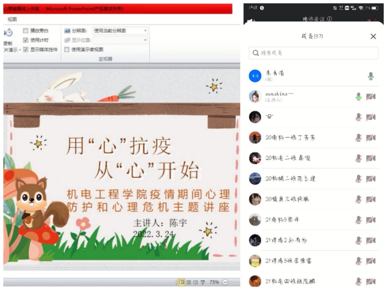 为疏导大学生在疫情封校时期导致的心理压力,3月24日18:30,成人在线观看视频陈宇老师通过腾讯会议,为2020、2021级各班心理委员召开“用‘心’抗疫,从‘心’开始”疫情期间心理防护与心理危机线上培训讲座,通过讲座学会自我调节方法,增强心理免疫力,进而帮助更多需要帮助的同学。