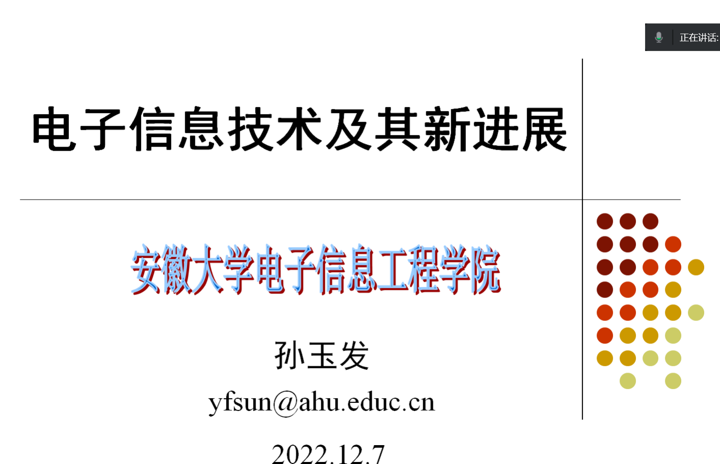 为使我校师生了解电子信息技术及其新进展相关知识,12月7日19:00-20:00,成人在线观看视频开展了“电子信息技术及其新进展”学术讲座,此次学术讲座主讲人为安徽大学电子信息工程学院教授、博士生导师孙玉发,成人在线观看视频老师及学生通过腾讯会议的线上方式参加了此次讲座。
