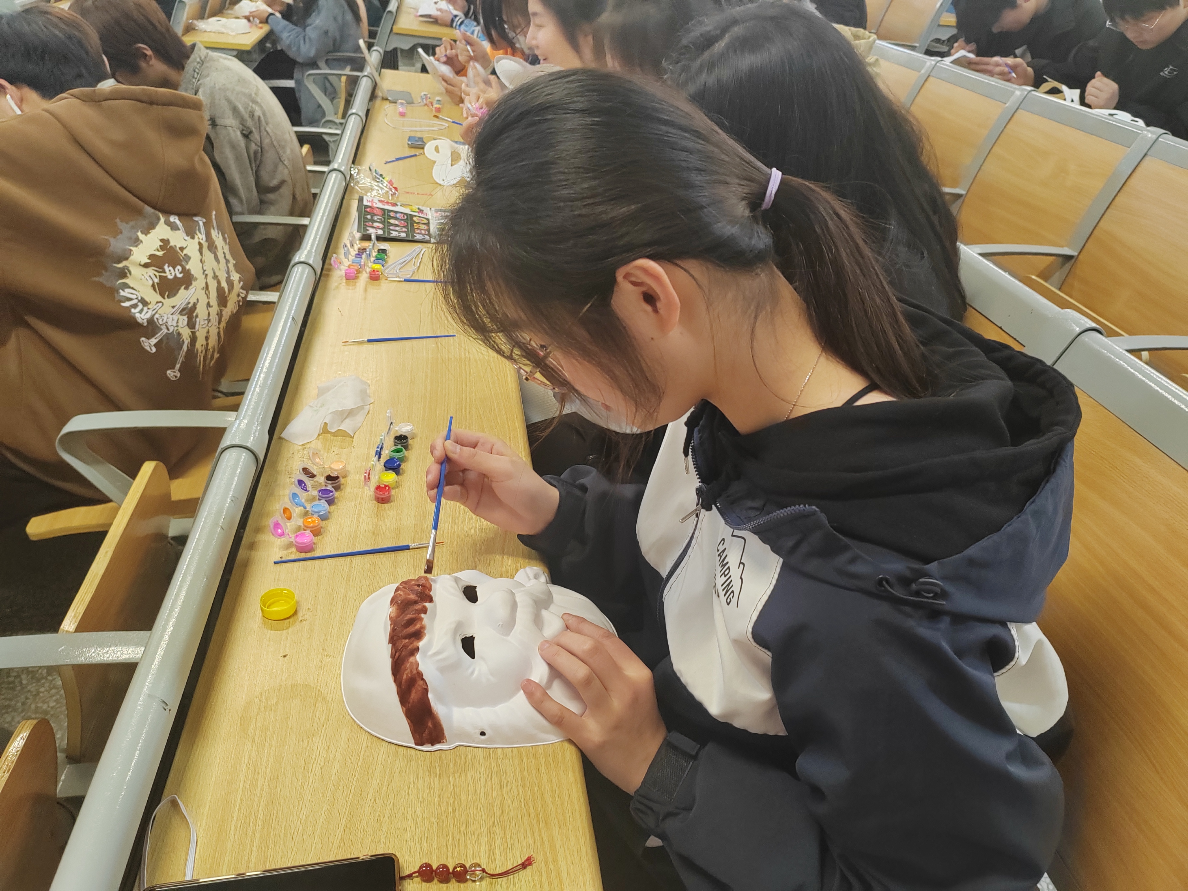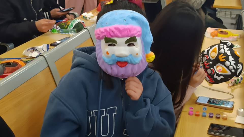 本次活动吸引了近200人参加,在教室里大家用画笔勾勒线条,互相讨论面具图案。一幅幅生动灵趣的图案在面具上一一呈现,有憨态可掬的猪八戒、有慈眉善目的圣诞老人、有小巧玲珑的狐狸等等,大家互相欣赏彼此的面具图案,在教室里欢声笑语。