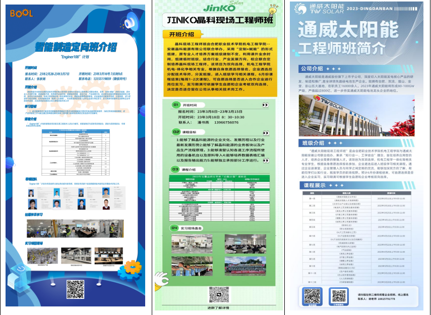 面对产业转型升级发展的新形势,现场工程师已经成为先进装备制造业乃至整个国民经济发展的迫切需求。根据现场工程师“出现”于生产和建设一线,“现身”于管理和服务现场,“战斗”于一线职业场景,具备工匠精神,“精操作、懂工艺、会管理、善协作、能创新”,能第一时间解决现场问题的特点,成人在线观看视频根据合肥市高端装备制造业的岗位需求,在与安徽博清自动化科技有限公司、安徽中显智能机器人有限公司组建的智能焊接订单班和机器视觉“尖兵班”的基础上,联合安徽晶科能源有限公司组建晶科现场工程师班,安徽布尔自动化工程有限公司智能制造定向班,通威太阳能(安徽)有限公司通威现场工程师班。