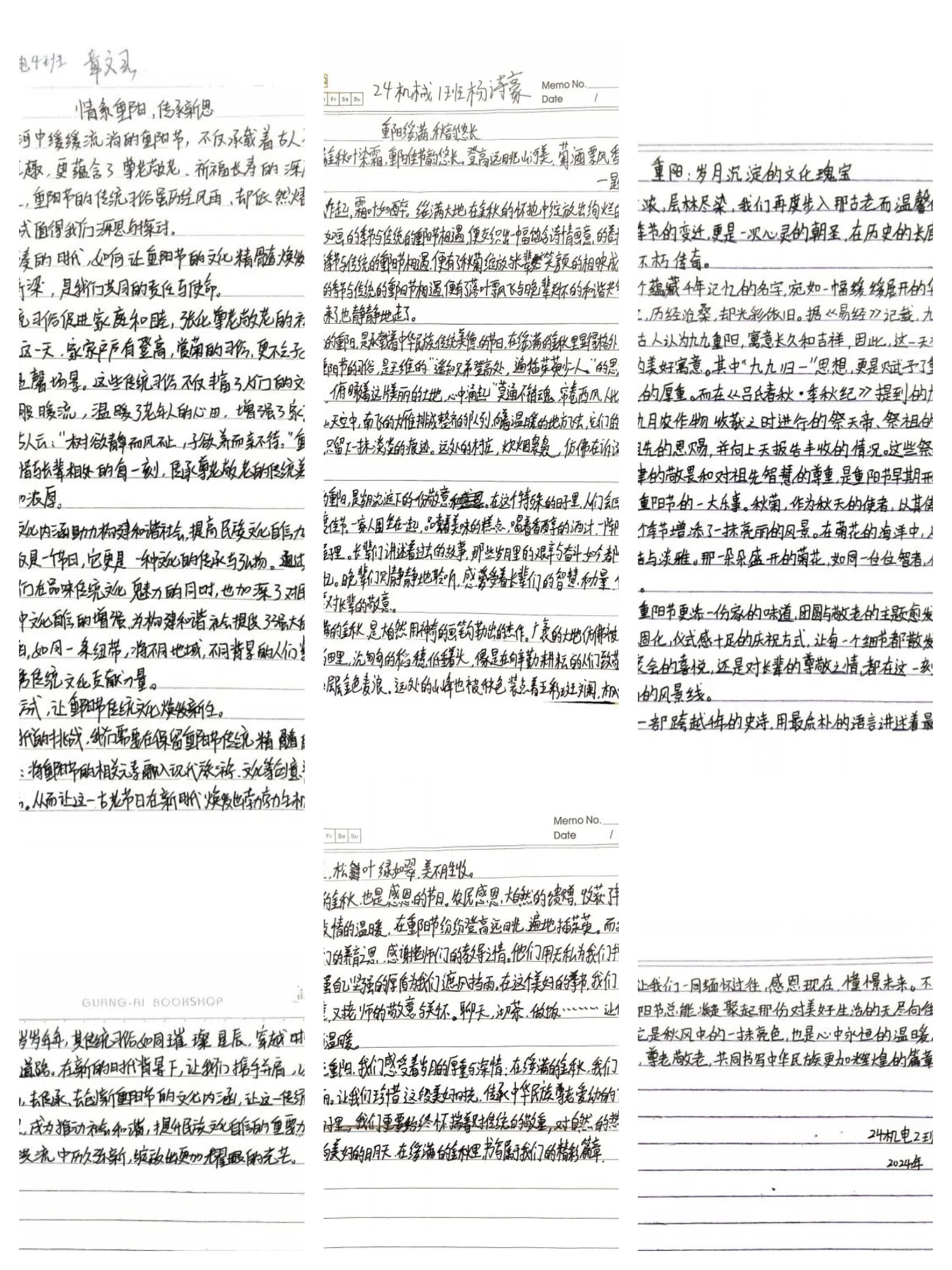 本次活动历时9天,在筹备期间,团总支利用公众号、班级教育课等形式对活动进行了线上线下的广泛宣传,吸引了众多学子报名,最终经过筛选20名同学进入到评审环节。参赛学生结合自身经历,以不同角度书写了对重阳节文化内涵的理解以及对敬老孝亲精神的思考。