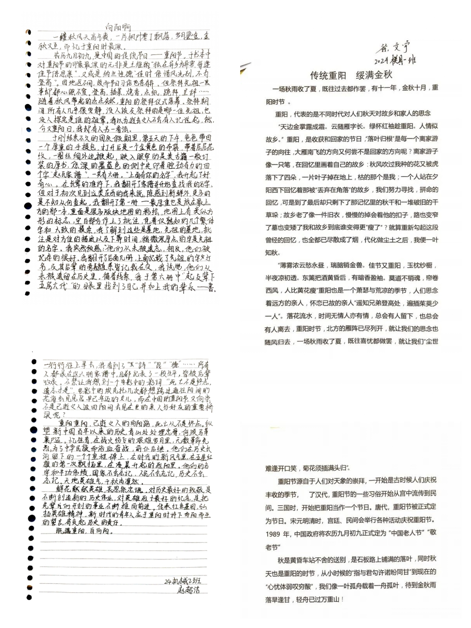 活动过程中,同学们还互相交流自己的写作心得,深入了解重阳节的历史渊源、文化内涵和节日习俗。经过初审、复审和老师评审,最终评选出,一等奖:24机械4班赵高强;二等奖:24机械2班赵超洁、24模具1班徐文宇;三等奖:24机电4班章文君、24机械1班杨诗豪、24机电4班高凯歌。获奖作品不仅文辞优美,更深入挖掘了重阳节的历史文化内涵,展现了当代青年在继承与发扬传统文化中的责任与使命感。活动结束后,获奖同学纷纷表示,通过参与此次活动,他们不仅对重阳节有了更深的认识,还在与老师们的互动与交流中,感受到了尊老敬老的重要性。