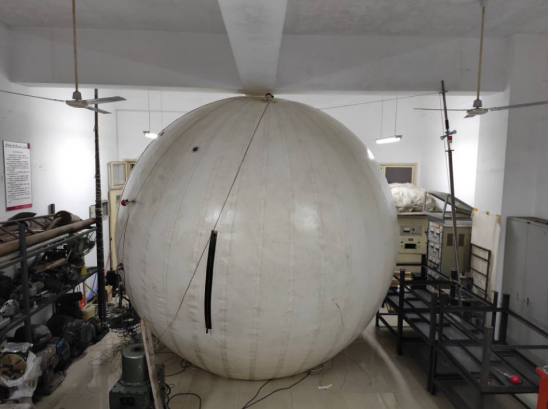 提出了一种飞艇氦气泄漏实验方法和装置,目的是在实验室模拟飞艇升空时的实验环境,提出氦气泄漏的实验室测量方法,建立氦气泄漏试验平台。试验平台包括大球连接与测量机构、小球连接与测量机构、充气机构。大球连接与测量机构包括大球、试验架、大球外表面蝴蝶结、绳子、压力传感器、热电偶、大球进气口;小球连接与测量机构位于大球内,包括大球内表面蝴蝶结、绳子、压力传感器、热电偶、航空插座、小球进气口,其中蝴蝶结和绳子连接有压力传感器;充气机构包括氦气瓶、充气泵、压力调节阀、内外进气连接口,用于调节大球和小球内的压力。