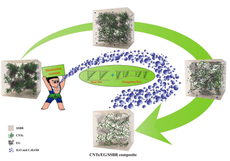 基于蒸汽爆破的技术原理,将现有的橡胶混炼设备进行有机的结合,利用硅烷化反应生成的 H2O 和 C2H5OH 在溶聚丁苯橡胶(SSBR)中产生的爆破效应,协同剪切流场和拉伸流场作用,促使层状堆积结构的膨胀石墨(EG)高效的剥离和分散,并与碳纳米管(CNTs)在SSBR 中 构 建 出 协 同 增 强 导 热 网 络 , 实 现 了 高 性 能 导 热CNTs/EG/SSBR 复合材料的连续制备。