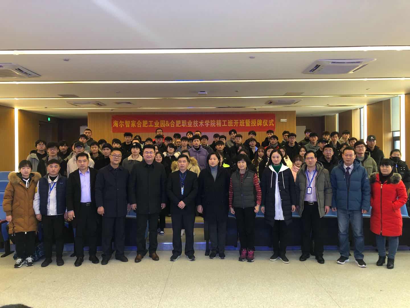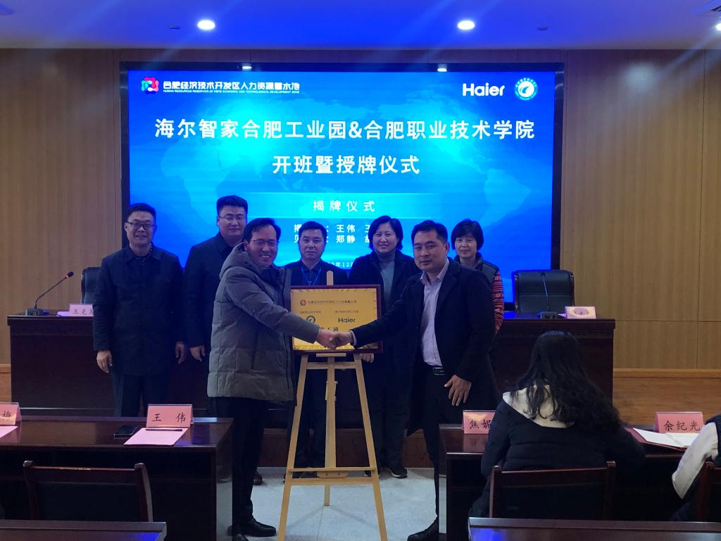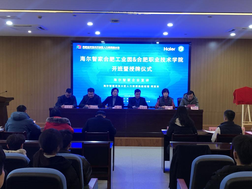 12月29日下午,成人在线观看视频与海尔智家合肥工业园精工班项目开班暨授牌仪式在汇心湖校区图书馆一楼学术报告厅举行。经开区人力资源中心副主任郑静、经开区人力资源中心企业服务部部长焦妮娜、海尔智家华东大区人力资源高级经理柯艮东一行、安徽爱沃客信息科技有限公司高级顾问纪丽一行、校党委副书记胡其云、成人在线观看视频党政领导班子成员、精工班全体同学及相关专业教师参加项目开班授牌仪式。