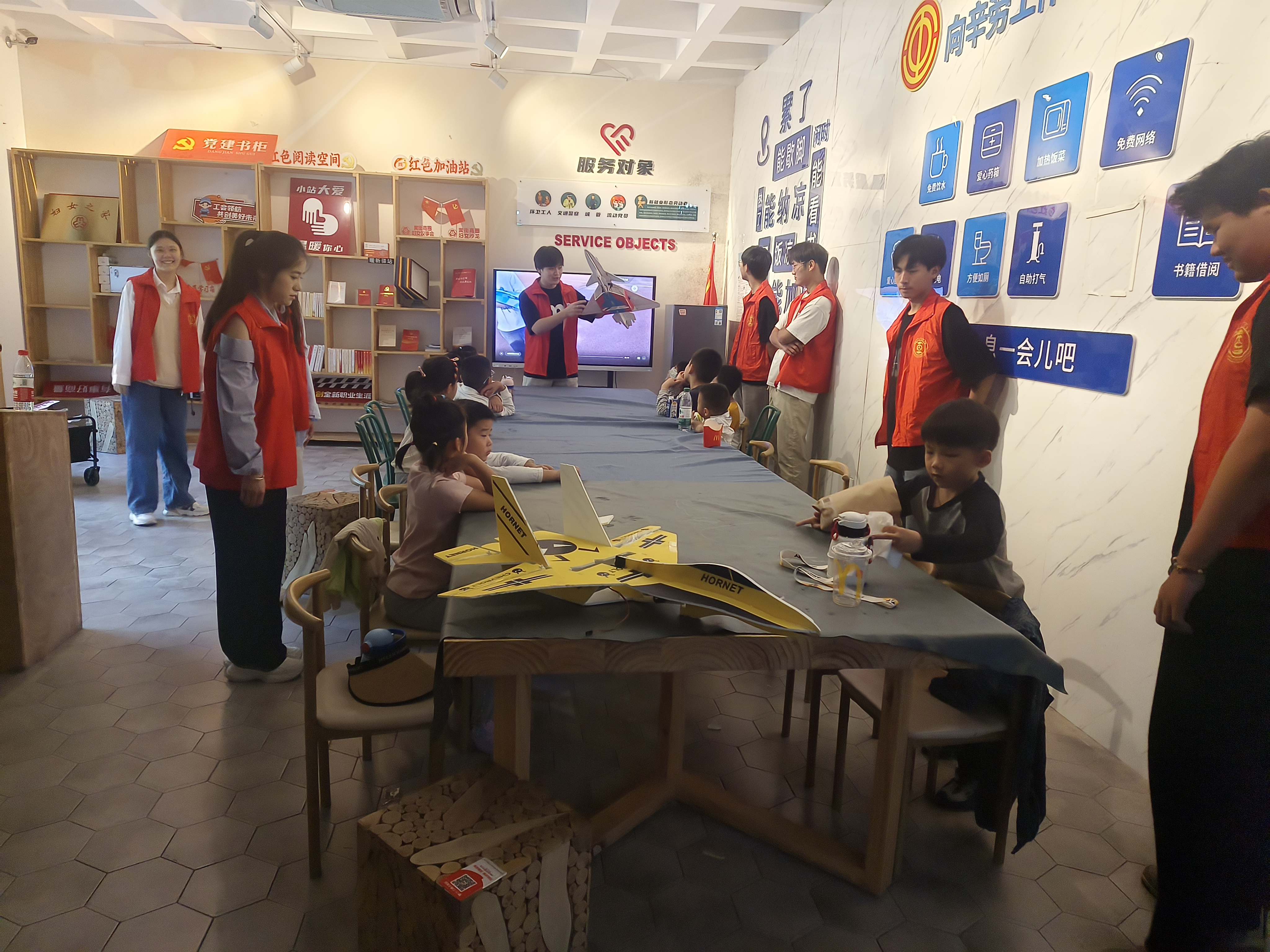为了向社区少年普及科学知识,传播科学思想,弘扬科学精神,树立科技兴国的信念,形成学科学、爱科学、用科学的科技文化氛围。新站磨店社区与成人在线观看视频团总支达成合作,邀请大学生志愿者们走进社区,定期开展“科普知识宣讲”活动,引领青少年接近科学、走近科学,提高青少年的科学文化素质。9月22日下午,成人在线观看视频“小螺钉”志愿服务队、航模协会成员来到磨店社区黉街悦书房书店和社区工作人员一起开展航模科普活动。