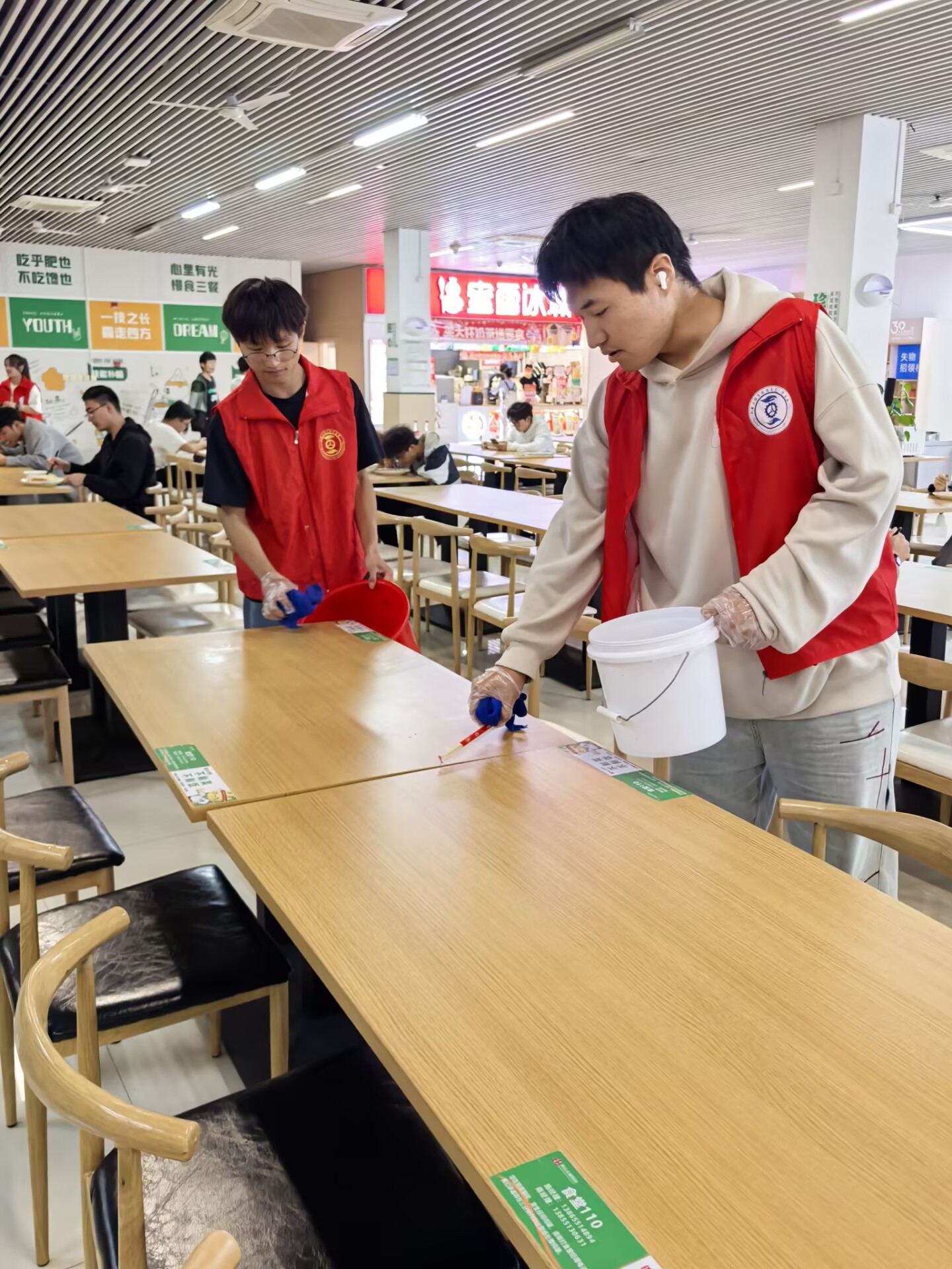 活动开始前,团总支对征集到的志愿者进行培训和工作分工。活动过程中,志愿者们协助餐厅工作人员维持秩序,清理餐桌和打扫地面,帮助餐厅阿姨打扫洗碗机。在学生用餐结束后,志愿者们及时清理餐桌上的残余食物和餐具,保持餐厅环境的整洁卫生。志愿者们弘扬“奉献、互助、友爱、进步”的志愿服务理念,以实际行动传播文明、传递温暖。在活动过程中,志愿者们还积极向广大同学倡导文明用餐,通过口头提醒等方式,倡导同学们节约粮食,减少浪费。此外,志愿者们还热情地与食堂阿姨交流,这不仅让志愿者们更加深入地了解社会工作的实际情况,也让食堂阿姨感受到了年轻一代的关心与支持。
