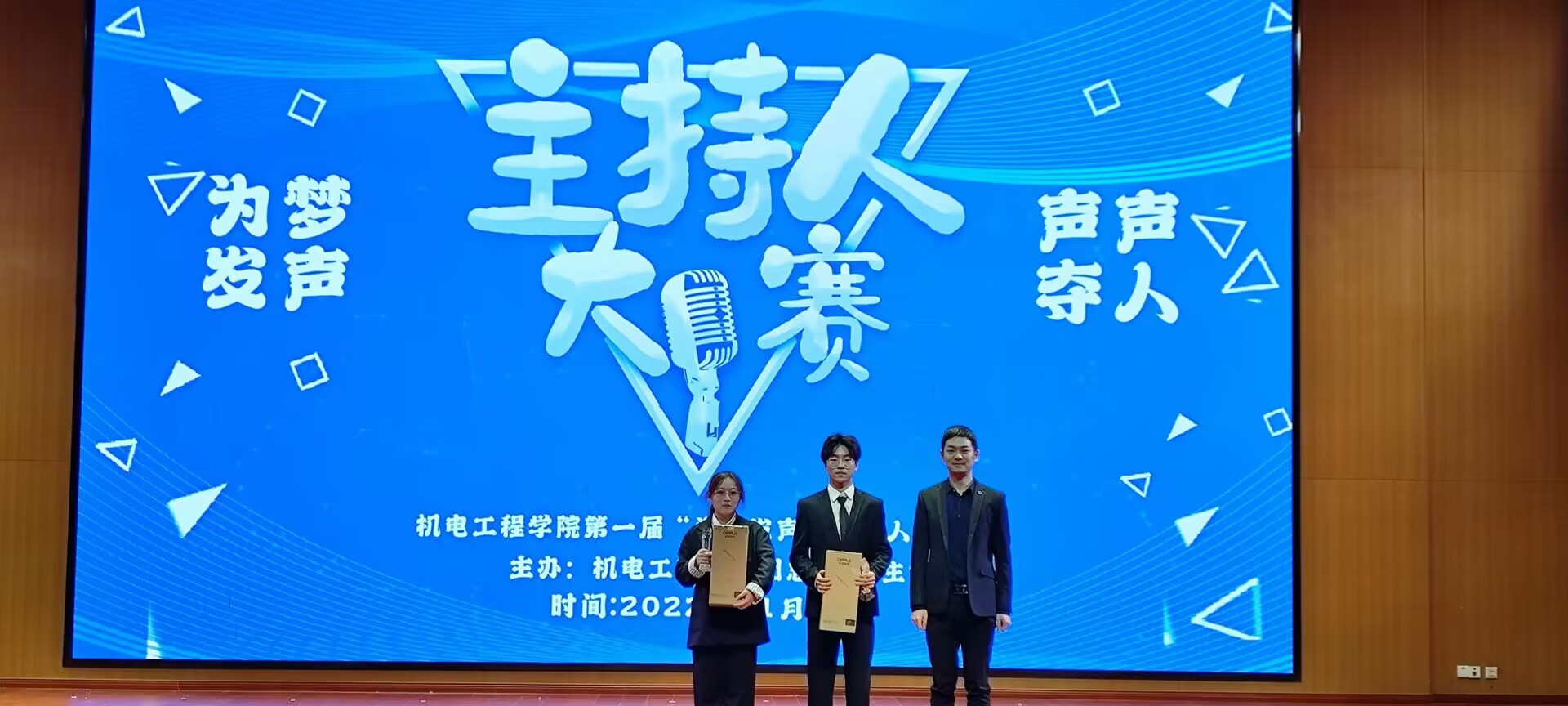 本次赛事经过前几轮的初赛及复赛,共有顾越等11位选手脱颖而出、同台争风。现场决赛共分为3个环节,分别是:自我介绍、主持解说以及才艺加分秀。选手们根据抽签决定出场顺序,比赛过程中,参赛选手斗志昂扬,神采奕奕。他们在舞台上毫不胆怯,各式各样的自我介绍让人耳目一新,还有沉浸式的主持解说内容,让人仿佛身临其境。特别是各选手们的才艺加分秀,让我们看到主持人不仅会主持,而且多才多艺。最终经过激烈角逐,李轩同学一路过关斩将,凭借其丰富的主持经验和稳定的发挥,最终夺得了比赛一等奖;储晨和顾越同学获得比赛二等奖;黄攀攀、刘珂娜和杨建安同学获得比赛三等奖。