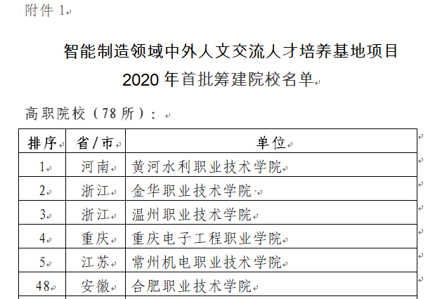 近日,从教育部中外人文交流中心发布的《关于智能制造领域中外人文交流人才培养基地项目2020年入选院校的通知》获悉,全国遴选了新疆大学等8所本科院校、黄河水利职业技术学院等78高职院校和温州市职业中等专业学校等14所中职学校为智能制造领域中外人文交流人才培养基地项目2020年首批筹建合作院校。我校成人在线观看视频与教务处代表学校积极申报并成功入选首批筹建合作院校,也是安徽省唯一一所高职院校。