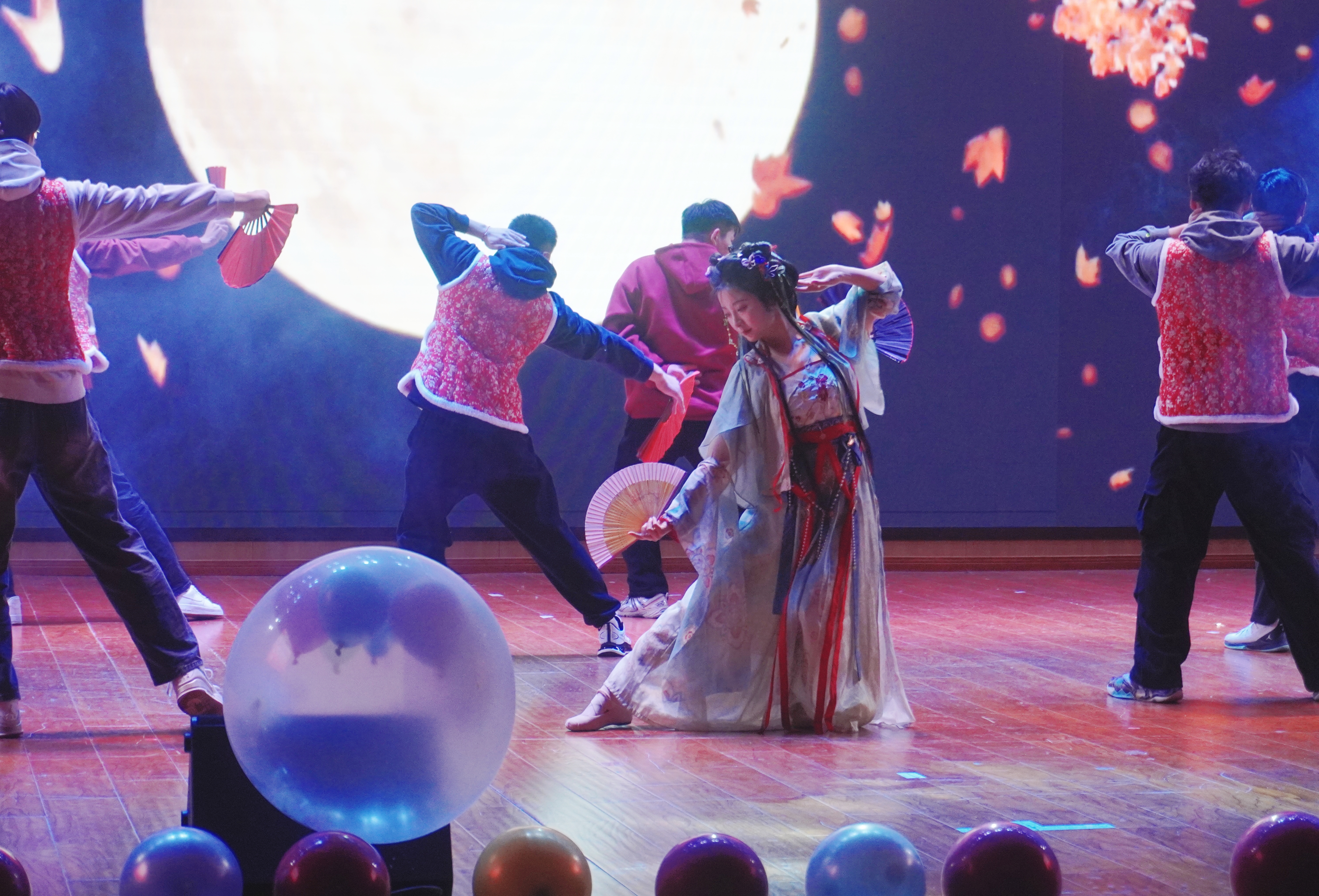 灯光聚焦,青春的热情率先在舞台上点燃。由雷宁老师和24级全体班长带来的开场舞《妙舞星河》拉开了晚会的序幕。他们灵动的舞姿与唯美的画面完美融合,瞬间点燃了现场观众的热情,将大家带入了新年的欢乐氛围之中。经典粤语歌曲《月半小夜曲》被深情演绎,让观众沉浸在其悠扬的旋律中。吉他弹唱《退后》则凭借其巧妙的旋律和节奏变化,引领观众穿梭于那充满无限可能的青春时光,赢得了阵阵掌声。李卓芳、程梦欣带来的古风爵士舞凭借创意编排和民族元素,引领观众步入一个全新的舞蹈世界。小品《绽放自己》和情景剧《白雪公主奇幻历险记》凭借幽默风趣的表演成为晚会的一大亮点,演员们精彩的演绎引得在场观众笑声不断,掌声此起彼伏,同时也传递出勇敢面对内心恐惧、突破舒适区的积极正能量。