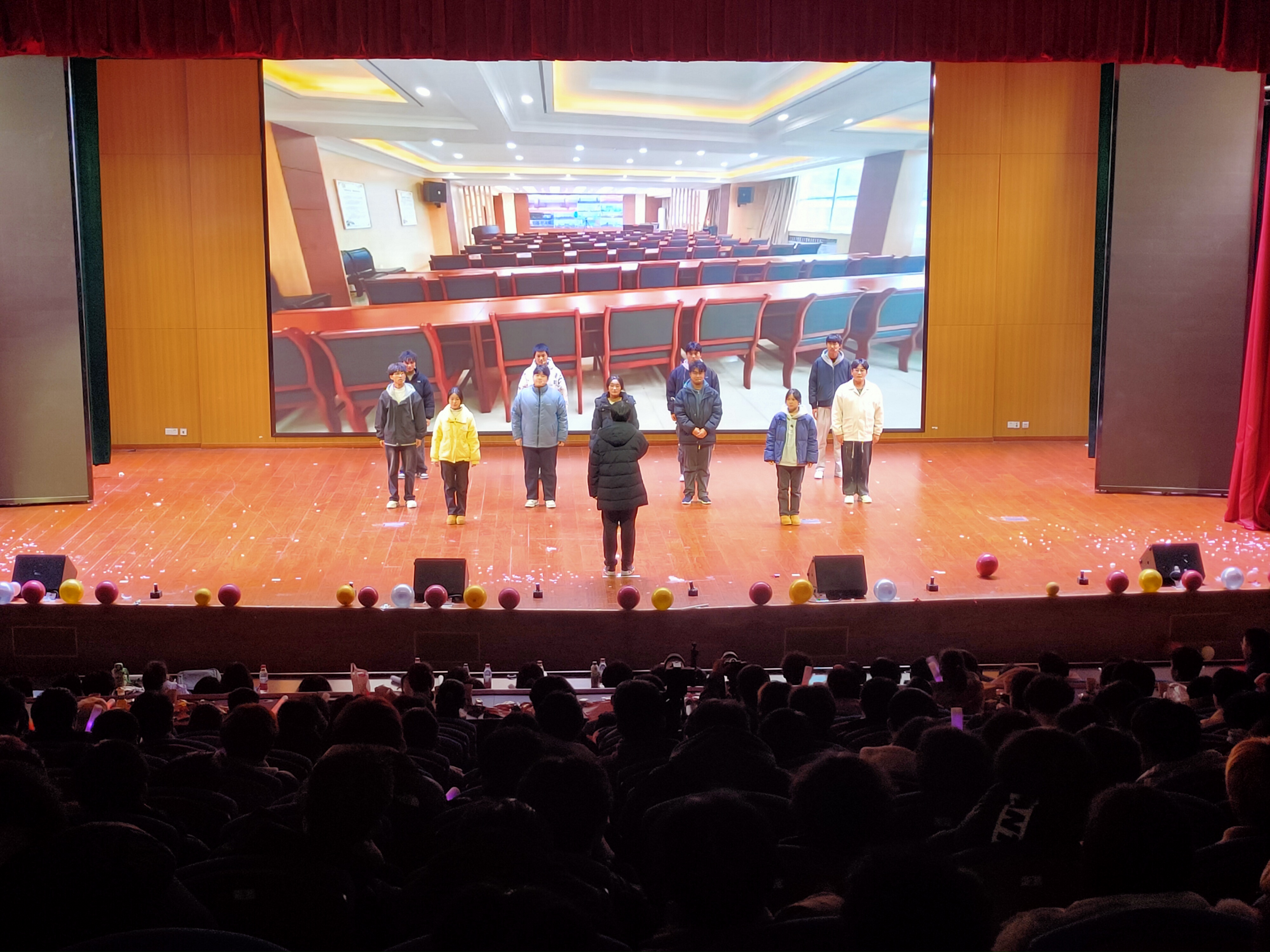 晚会进程中还穿插了游戏互动环节,主持人通过知识问答与描“福”挑战关卡等互动性较强的游戏,使得现场气氛逐步攀升。最终,晚会在24储能班同学集体演唱的《青苹果乐园》旋律中圆满落幕。