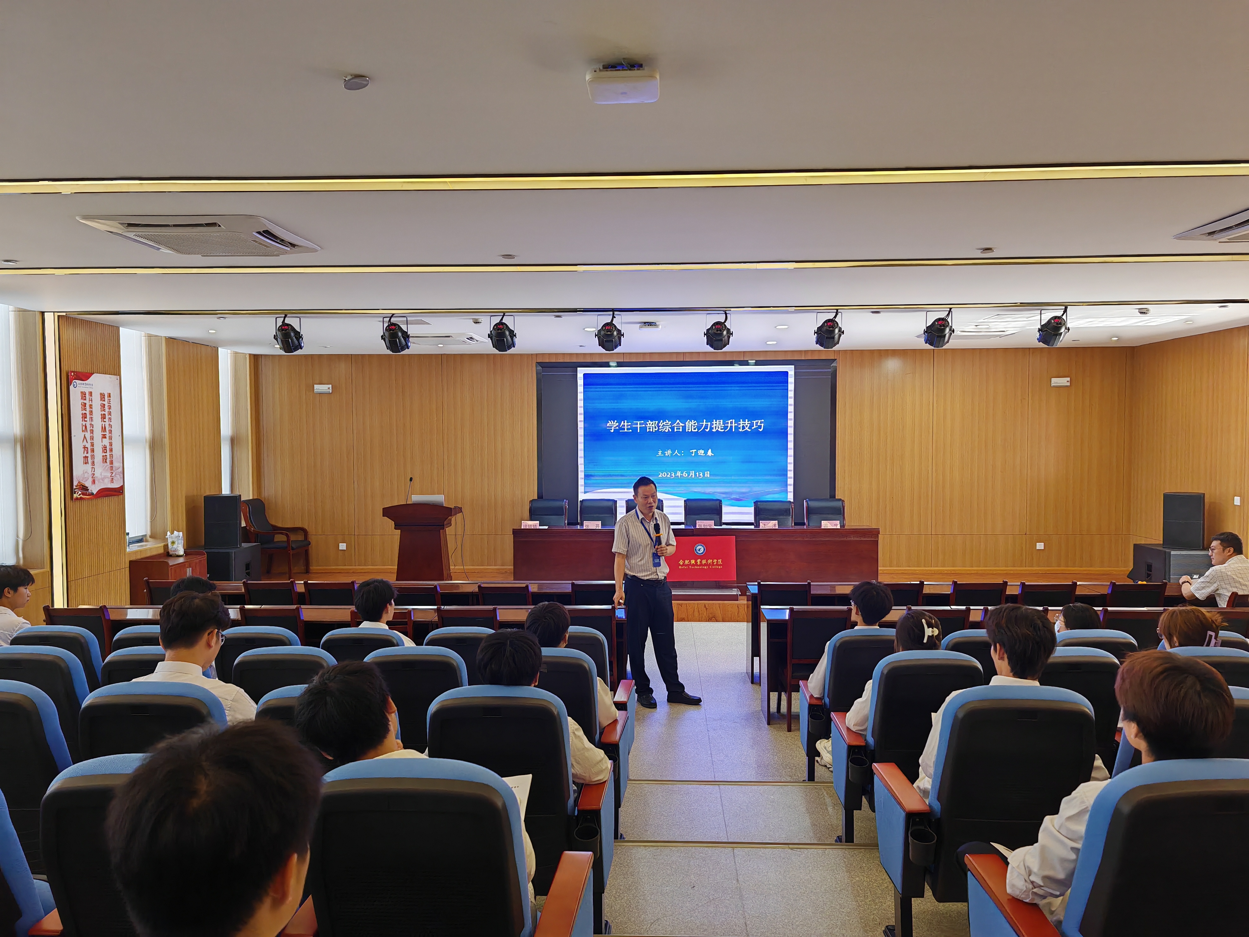 最后,丁迎春为学员们带来以《学生干部综合能力提升技巧》为主题的精彩讲座。他指出,学生干部要做好学生工作,紧密结合国家政策和学校相关规定,把握学生工作的发展趋势,提升工作的前瞻性。要明白学生干部工作的责任与义务,充分发挥在“自我教育、自我管理、自我服务、自我监督”中的模范带头作用,实现由自我中心角色向任务角色再向维护角色转变。