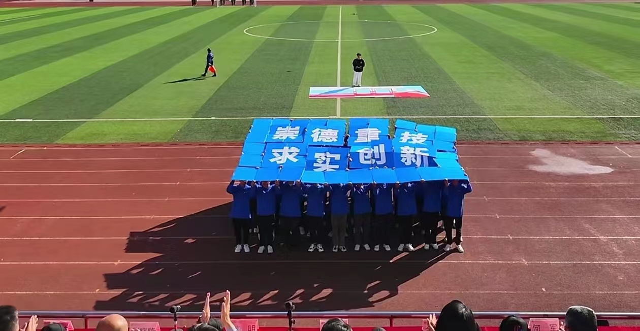 运动会开幕式中,各个学院代表队依次入场,该院学子身着蓝色统一队服,精神抖擞,神采飞扬,迈着整齐的步伐,喊着嘹亮的口号,他们双手高举“崇德、重技、求实、创新”的校训,并伴着航模社的无人机表演,展现了学生蓬勃的青春活力与昂扬的精神风貌。
